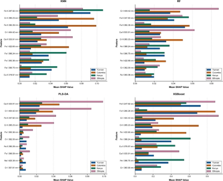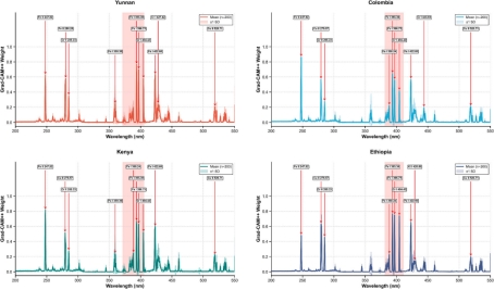 实验结果表明,该模型对云南、哥伦比亚、肯尼亚、埃塞俄比亚四个产地咖啡的鉴别准确率与 F1 分数均达到 99.00%,显著优于 XGBoost(95.75%)、PLS - DA(92.50%)等传统算法,且在 30 dB 强噪声干扰下准确率仍超过 94%。团队借助 SHAP 与 1D Grad - CAM++ 双路径解释框架,明确了 Fe、Cr、Cu、K 等元素的协同作用是鉴别核心,验证了结果的科学性。