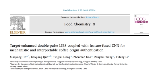 近期,我院的研究团队在咖啡产地溯源技术领域实现了重大突破,相关研究成果以 “Target-enhanced double-pulse LIBS coupled with feature-fused CNN for mechanistic and interpretable coffee origin authentication” 为题,发表于国际知名食品期刊《Food Chemistry: X》。该论文以东莞理工学院为第一完成单位,南宁师范大学、华南理工大学为合作单位,本校何小勇博士担任通讯作者,团队成员参与了实验设计、数据处理以及模型优化等核心工作。