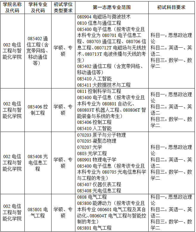 (1)接收第一志愿报考通信工程(含宽带网络、移动通信等)(085402)、人工智能(085410)、大数据技术与工程(085411)、电磁场与微波技术(080904)、信息与通信工程(0810)的考生;