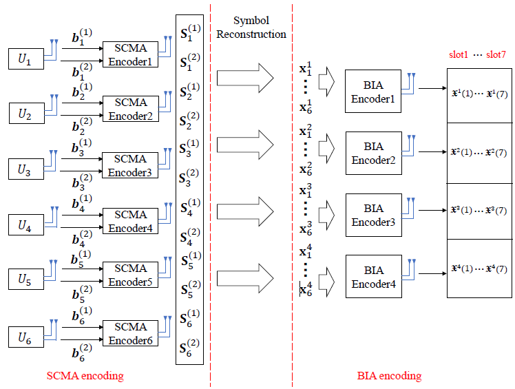 1.层次化编码框架:在保持SCMA多维调制与BIA干扰消除优势的同时,实现分集增益与复用增益的平衡。